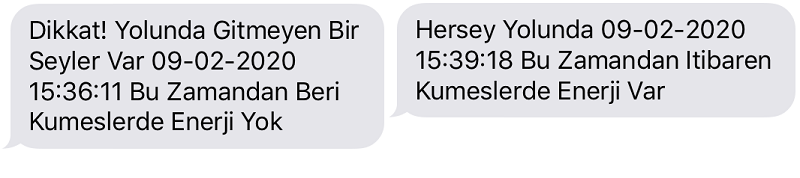 4. Sistem Enerji kesintilerini takip edecek ve enerji kesildiğinde enerji kesik bilgisini SMS (kısa mesaj) ve Çağrı gönderme yoluyla bildirecek. Enerji gelmediği sürece periyodik olarak SMS (kısa mesaj) iletileri ve Çağrı göndermeye devam edecek, enerji geldiği an her şeyin normale döndüğüne dair SMS iletisi ve Çağrı gönderecektir.